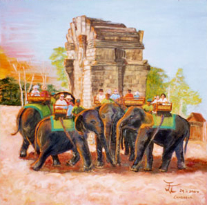 | Titel: Cambodja Datum: 2004 Techniek: Olieverf op linnen Afmetingen: 100cm x 100cm Eigendom van galerie Omschrijving: Geinspireerd door de Ankor Wat & de Ankor Thom. Schitterende resten uit het Khmer tijdperk temidden van een jungle. Dit was een tocht naar boven om de ondergaande zon te bewonderen. Dit kon natuurlijk ook lopend, maar op de olifanten was het leuk en avontuurlijk. Tot mijn verbazing waren de olifanten opvallend “donker Grijs’. Het blijkt dat de cambodjanen hun olifanten verfen. Het was een leuk gezicht, deze olifanten met hun mooi uitgesneden houten bakjes